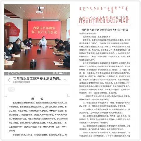 在抗疫特殊時期,百年酒業一直心系經銷商朋友和全體員工。2月6日,分別發出百年酒業致全國經銷商朋友、致全體員工的一封信,鼓勵大家堅定抗疫勝利信心,做好防護,在這場沒有硝煙的戰斗中,百年酒業一直在行動,百年酒業全體員工與經銷商朋友一直在努力。根據公司的部署安排,通過電子辦公平臺、電話、微信、QQ群、釘釘等方式全員進行學習《疫情防控科普知識》、《公司2020年營銷生產行動綱要》、《安全生產知識》等培訓,并充分做好復工復產準備工作。